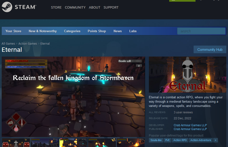 Eternal is an action game inspired by From Software’s souls-like games and designed specifically for a casual audience while retaining a souls-like gameplay loop. Players can expect to fight a variety of enemies across several distinct levels all set in a medieval fantasy landscape using a variety of weapons, magical spells, and consumables.