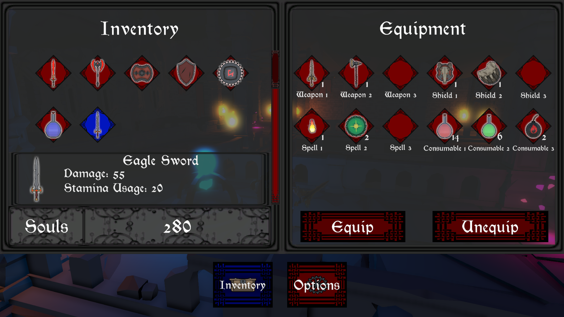 Items can be moved by clicking on them and the target destination or by using a drag & drop feature that I made. An item's name, icon, and statistics are all shown inside the inventory window whenever an item is selected. Long lists of items can be browsed using the inventory scrollbar and elements that are out of the inventory window's bounds are hidden using a mask. The inventory UI also features buttons for equipping and unequipping items and a counter for the points collected by the player.